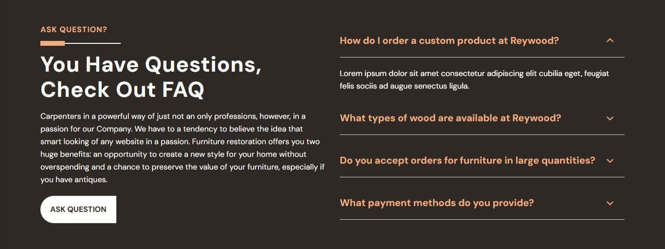 [row][column col="6" subcls="custom-faq"][custom_heading sub_title="Ask Question?" sub_title_color="#efad81" sub_title_font_size="16px" sub_title_font_family="DM Sans" title="You Have Questions, Check Out FAQ" title_color="#ffffff" font_size="44px" font_weight="700" font_family="DM Sans" align="left"]<p>Carpenters in a powerful way of just not an only professions, however, in a passion for our Company. We have to a tendency to believe the idea that smart looking of any website in a passion. Furniture restoration offers you two huge benefits: an opportunity to create a new style for your home without overspending and a chance to preserve the value of your furniture, especially if you have antiques.</p>[buttonstyle1 name="Ask Question" link="#" target="_blank"][/column][column col="6" subcls="custom-accordian"][accordion][accordion_content title="How do I order a custom product at Reywood?"]Lorem ipsum dolor sit amet consectetur adipiscing elit cubilia eget, feugiat felis sociis ad augue senectus ligula.[/accordion_content][accordion_content title="What types of wood are available at Reywood?"]Lorem ipsum dolor sit amet consectetur adipiscing elit cubilia eget, feugiat felis sociis ad augue senectus ligula.[/accordion_content][accordion_content title="Do you accept orders for furniture in large quantities?"]Lorem ipsum dolor sit amet consectetur adipiscing elit cubilia eget, feugiat felis sociis ad augue senectus ligula.[/accordion_content][accordion_content title="What payment methods do you provide?"]Lorem ipsum dolor sit amet consectetur adipiscing elit cubilia eget, feugiat felis sociis ad augue senectus ligula.[/accordion_content][/accordion][/column][/row]