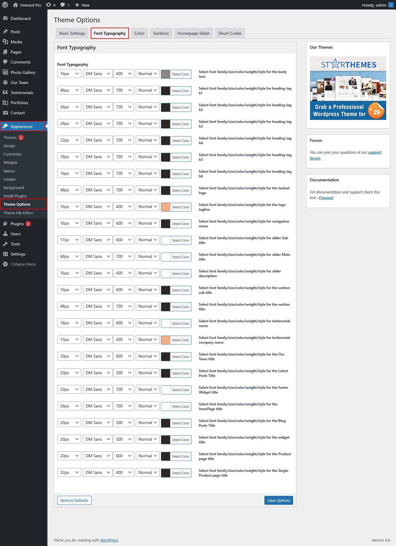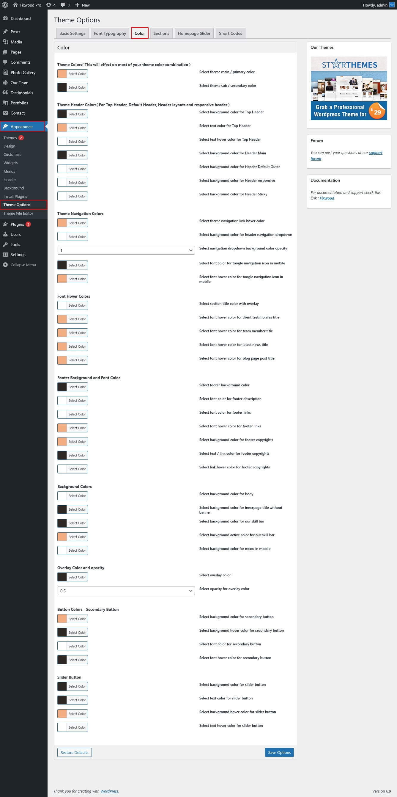 The following theme contains the Settings option. These settings allow you to change the theme’s color palette, order of items, turn items on/off and do lots of other things. In order to use these settings, please go to Appearance → Theme Options.