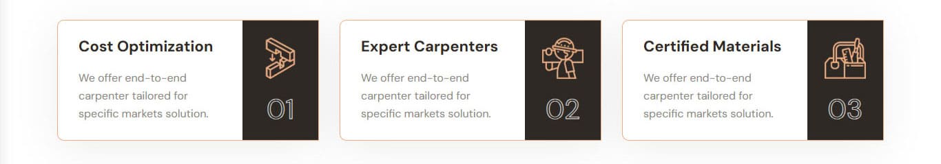 [row][column col="4"][feature_item image_path_icon="http://localhost/star/fixwood/wp-content/themes/fixwood-pro/images/fea-1.webp" title="Cost Optimization" desc="We offer end-to-end carpenter tailored for specific markets solution." number="01"][/column][column col="4"][feature_item image_path_icon="http://localhost/star/fixwood/wp-content/themes/fixwood-pro/images/fea-2.webp" title="Expert Carpenters" desc="We offer end-to-end carpenter tailored for specific markets solution." number="02"][/column][column col="4"][feature_item image_path_icon="http://localhost/star/fixwood/wp-content/themes/fixwood-pro/images/fea-3.webp" title="Certified Materials" desc="We offer end-to-end carpenter tailored for specific markets solution." number="03"][/column][/row]