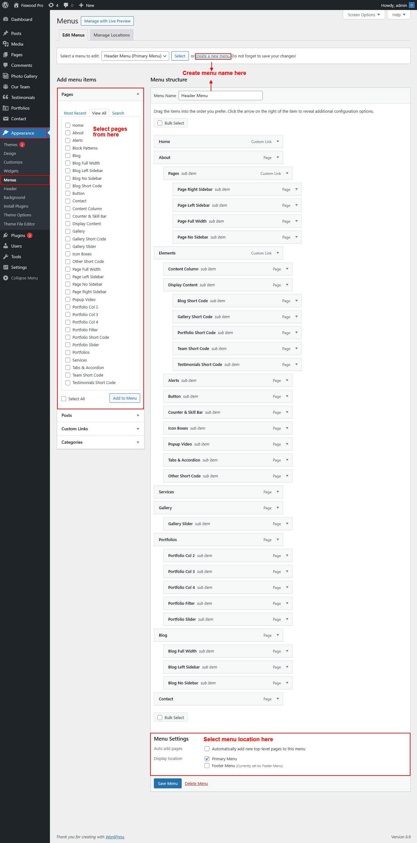 - For footer column 2: Go to Appearance >> Menu >> Create Menu >> Select Menu Location >> Add Menu. >> Our Services