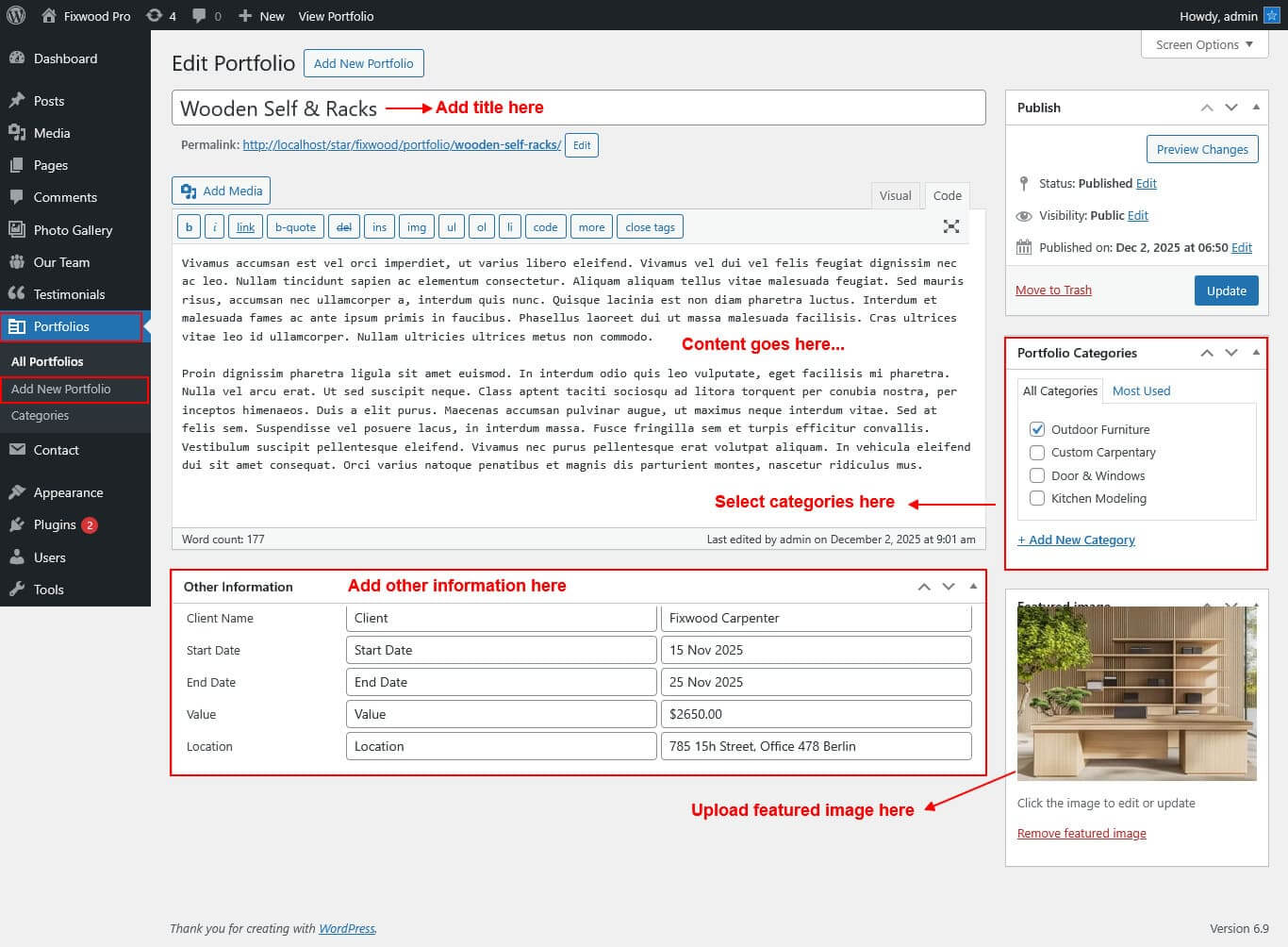 For setting up Our Portfolio Work section first of all you need to add some portfolio by using Portfolio post type please see the below screenshot.