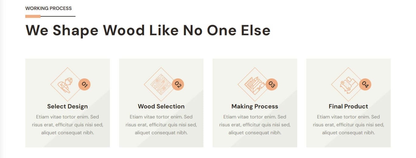 [row][column col="3"][process_item image_path_icon="http://localhost/star/fixwood/wp-content/themes/fixwood-pro/images/prc-1.webp" title="Select Design" desc="Etiam vitae tortor enim. Sed risus erat, efficitur quis nisi sed, aliquet consequat nibh." number="01"][/column][column col="3"][process_item image_path_icon="http://localhost/star/fixwood/wp-content/themes/fixwood-pro/images/prc-2.webp" title="Wood Selection" desc="Etiam vitae tortor enim. Sed risus erat, efficitur quis nisi sed, aliquet consequat nibh." number="02"][/column][column col="3"][process_item image_path_icon="http://localhost/star/fixwood/wp-content/themes/fixwood-pro/images/prc-3.webp" title="Making Process" desc="Etiam vitae tortor enim. Sed risus erat, efficitur quis nisi sed, aliquet consequat nibh." number="03"][/column][column col="3"][process_item image_path_icon="http://localhost/star/fixwood/wp-content/themes/fixwood-pro/images/prc-4.webp" title="Final Product" desc="Etiam vitae tortor enim. Sed risus erat, efficitur quis nisi sed, aliquet consequat nibh." number="04"][/column][/row]