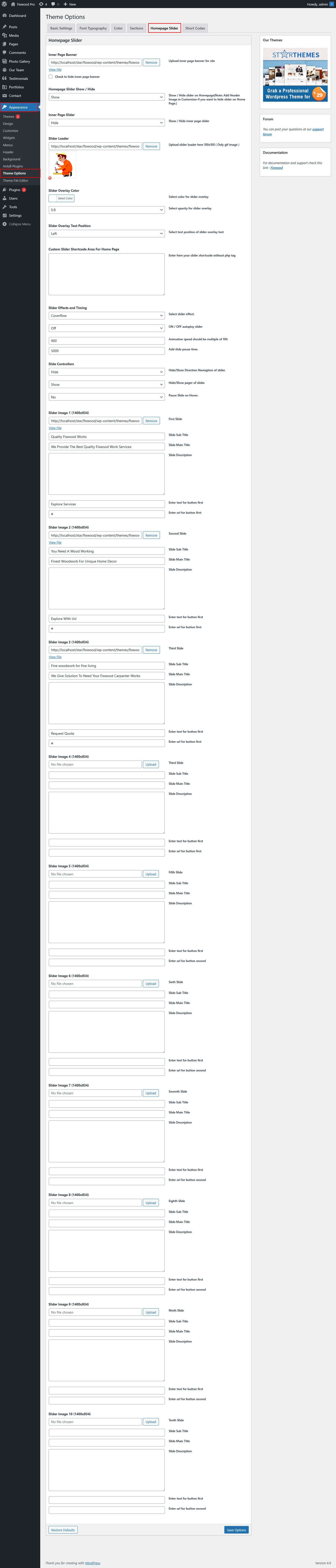 - For Slider: Go to Appearance >> Theme Options >> Homepage Slider >> Upload image, Add Title and Sub Title