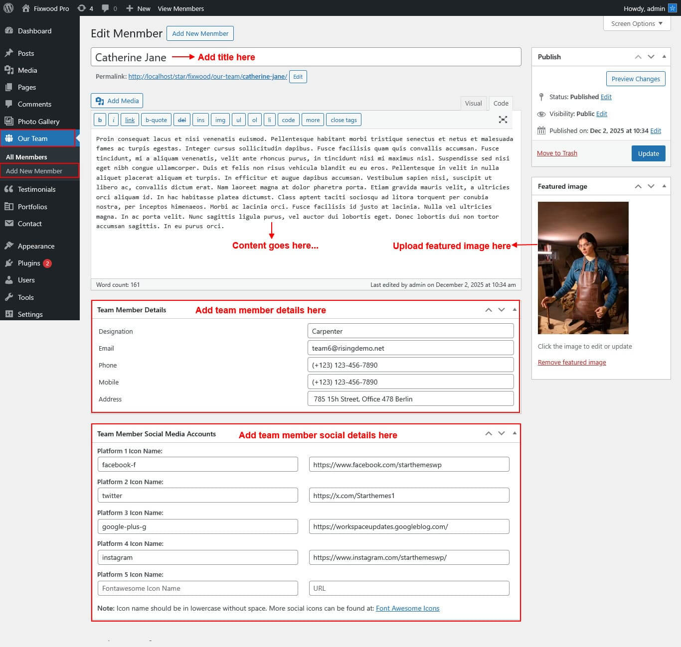 For setting up Our Experts Team section first of all you need to add some team by using Team post type please see the below screenshot.