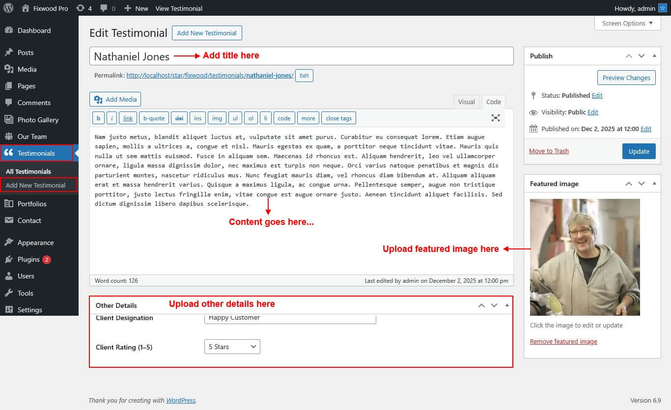 For setting up Client Testimonials section first of all you need to add some testimonials by using testimonials post type please see the below screenshot.